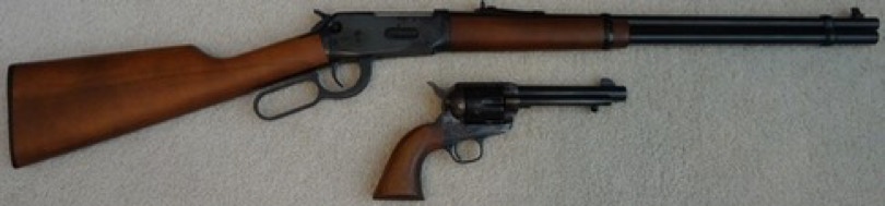 The guns that won the American West. A Winchester rifle (1894 Carbine) and Colt Single Action Army (Artillery Model).